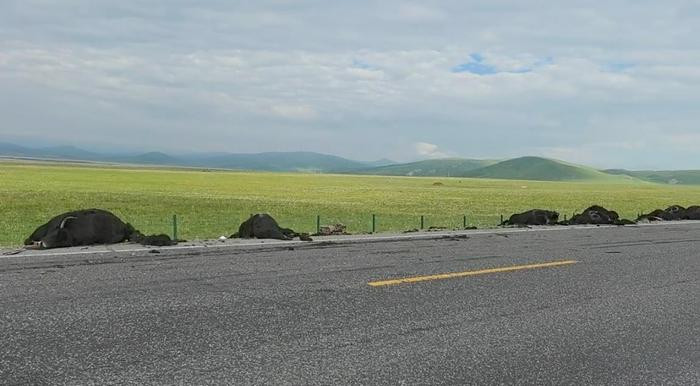 评论区有网友表示,一般情况下都是撞死一两头,这么多头牦牛是不是从车上摔死的。博主回复是大货车撞的。